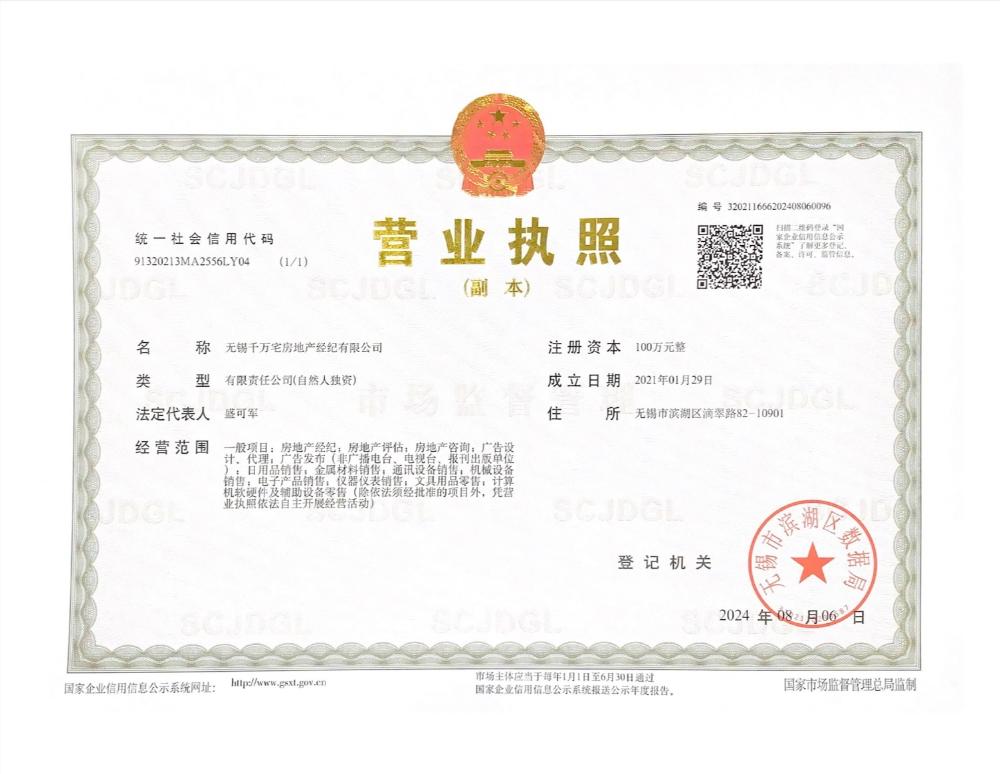 无锡千万宅房地产经纪有限公司统一社会信用代码:91320213MA2556LY04法定代表人:盛可军 成立日期:2021-01-29备案状态:有效备案证书号:锡滨建经备(2024)22号(临时)备案有效期:2024-12-20至2025-12-19发证机关:无锡市滨湖区住房和城乡建设局发证日期:2024-12-20 |