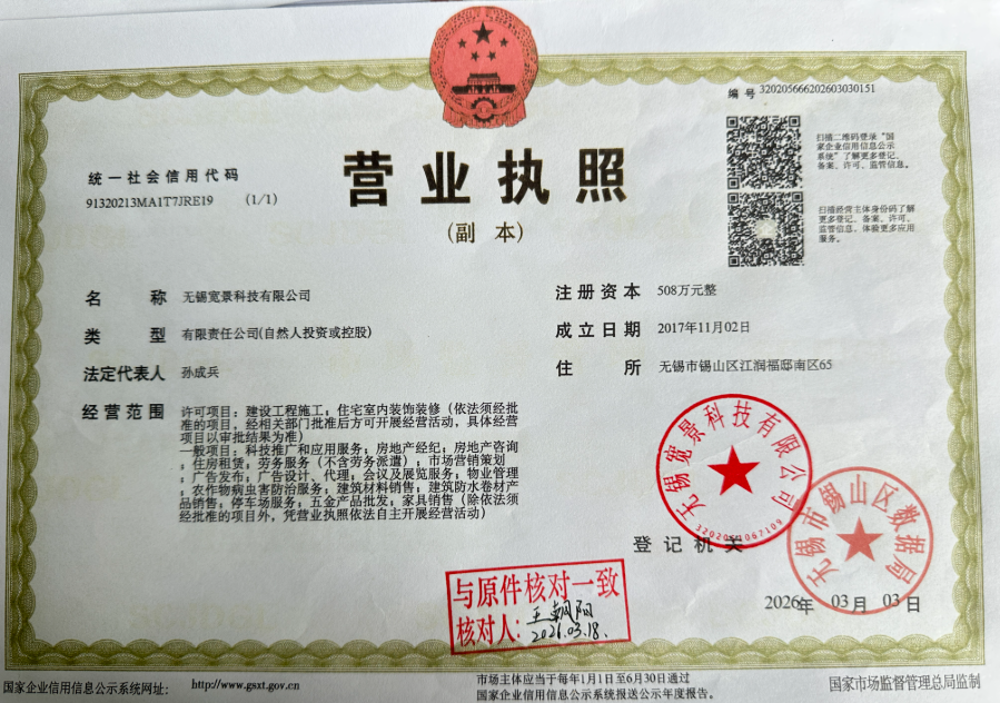 无锡宽景科技有限公司统一社会信用代码:91320213MA1T7JRE19法定代表人:孙成兵 成立日期:2017-11-02备案状态:有效备案证书号:锡锡建经备(2026)1号备案有效期:2026-03-19至2027-03-18发证机关:无锡市锡山区住房和城乡建设局发证日期:2026-03-19 |