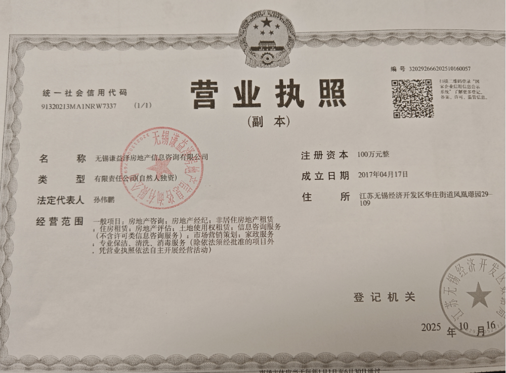 无锡谦益泽房地产信息咨询有限公司统一社会信用代码:91320213MA1NRW7337法定代表人:孙伟鹏 成立日期:2017-04-17备案状态:有效备案证书号:锡经建经备(2025)12号备案有效期:2025-10-29至2026-10-28发证机关:江苏无锡经济开发区建设局发证日期:2025-10-28 |